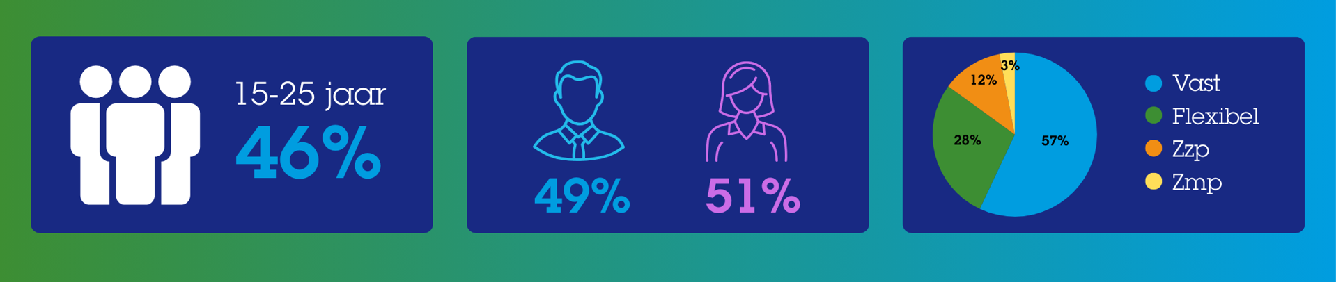 Binnen deze groep vallen een aantal dingen op. Zo is 46% van de flexwerkers tussen de 15 en 25 jaar. Flexibel werk vormt voor veel jongeren een eerste stap op de arbeidsmarkt, bijvoorbeeld naast studie of als opstap naar een vaste baan.