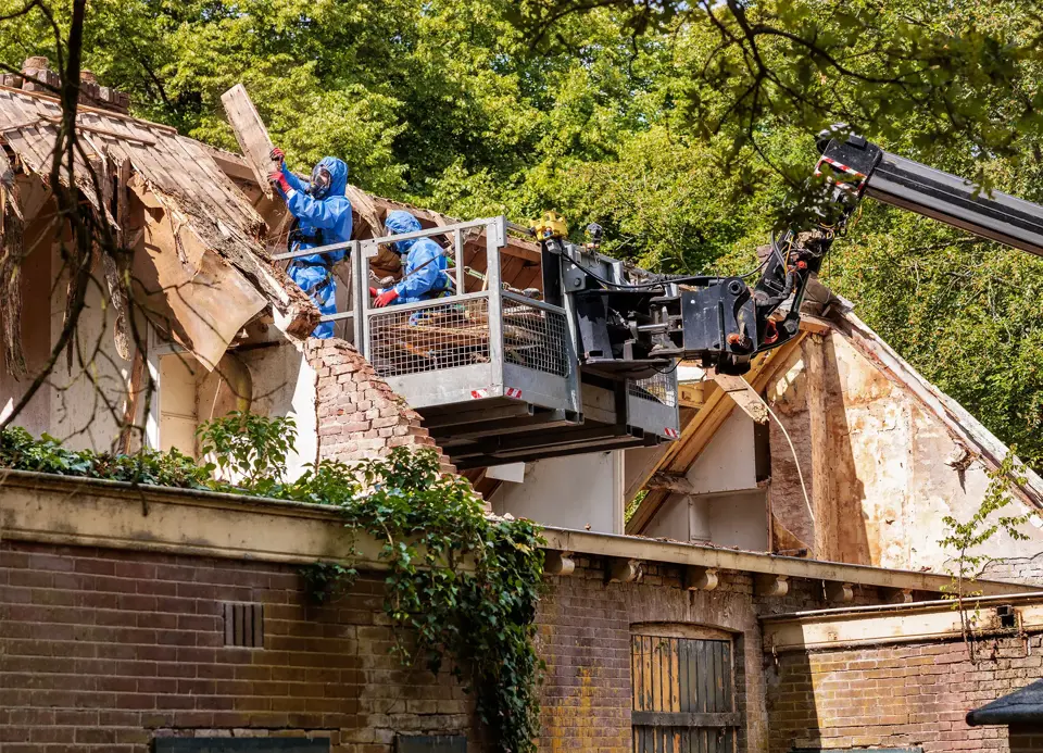 “De werkzaamheden die we uitvoeren zijn heel divers omdat deze afhankelijk zijn van het type project. De ene keer saneren we een monumentaal pand en de andere keer een stal, maar hoe we werken is wel altijd volgens strenge eisen. Zo werken we maximaal twee uur achter elkaar in onze beschermende kleding en hebben we daarna één uur pauze waarin we eventuele lichte werkzaamheden buiten de asbestzone mogen uitvoeren. Op een dag zitten we dus gemiddeld vijf tot zes uur in ons pak.”